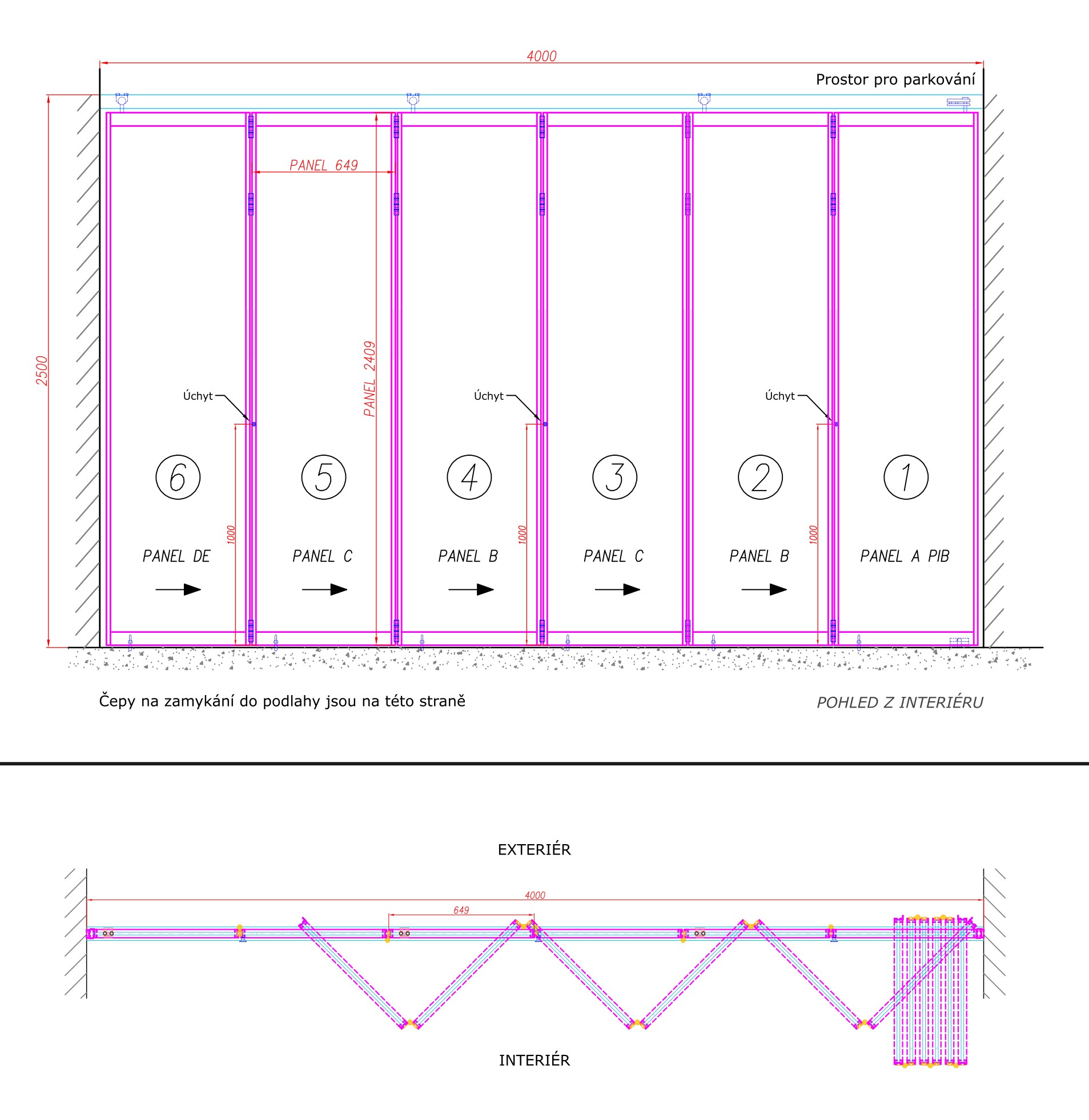 Uvedená cena je za skládací stěnu o rozměru 4000 x 2500 mm (š x v), 6 panelů s čirým bezpečnostním sklem ESG 10 mm. Kolejnice a kování jednotlivých panelů jsou v povrchové úpravě stříbrný elox. Montážní materiál není součástí dodávky.