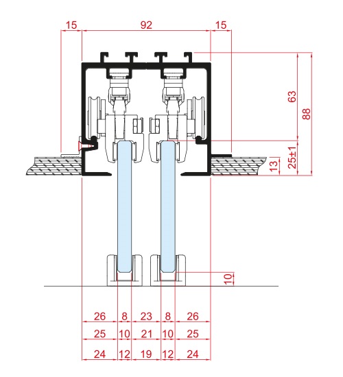 Dvojitá kolejnice pro posuvný systém SOLO LIGHT 80 s montáží do podhledu/sádrokartonu.