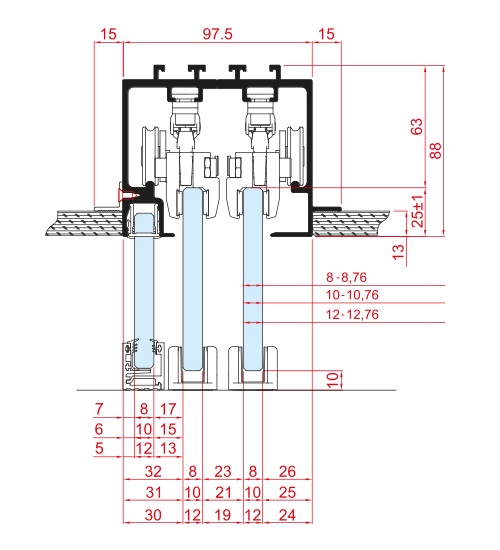 Dvojitá kolejnice s fixním dílem pro posuvný systém SOLO LIGHT 80 s montáží do podhledu/sádrokartonu.