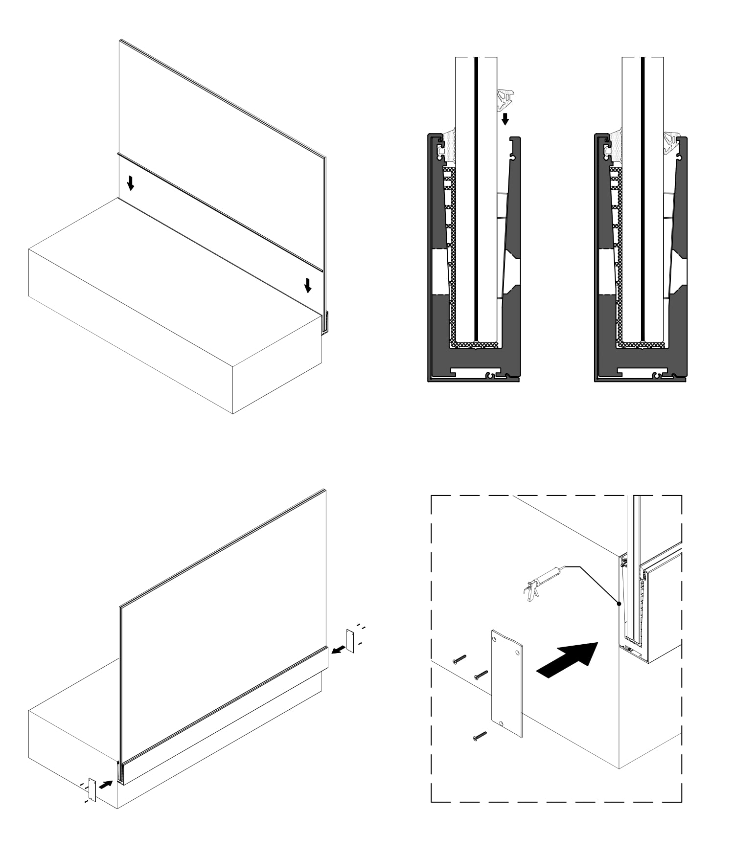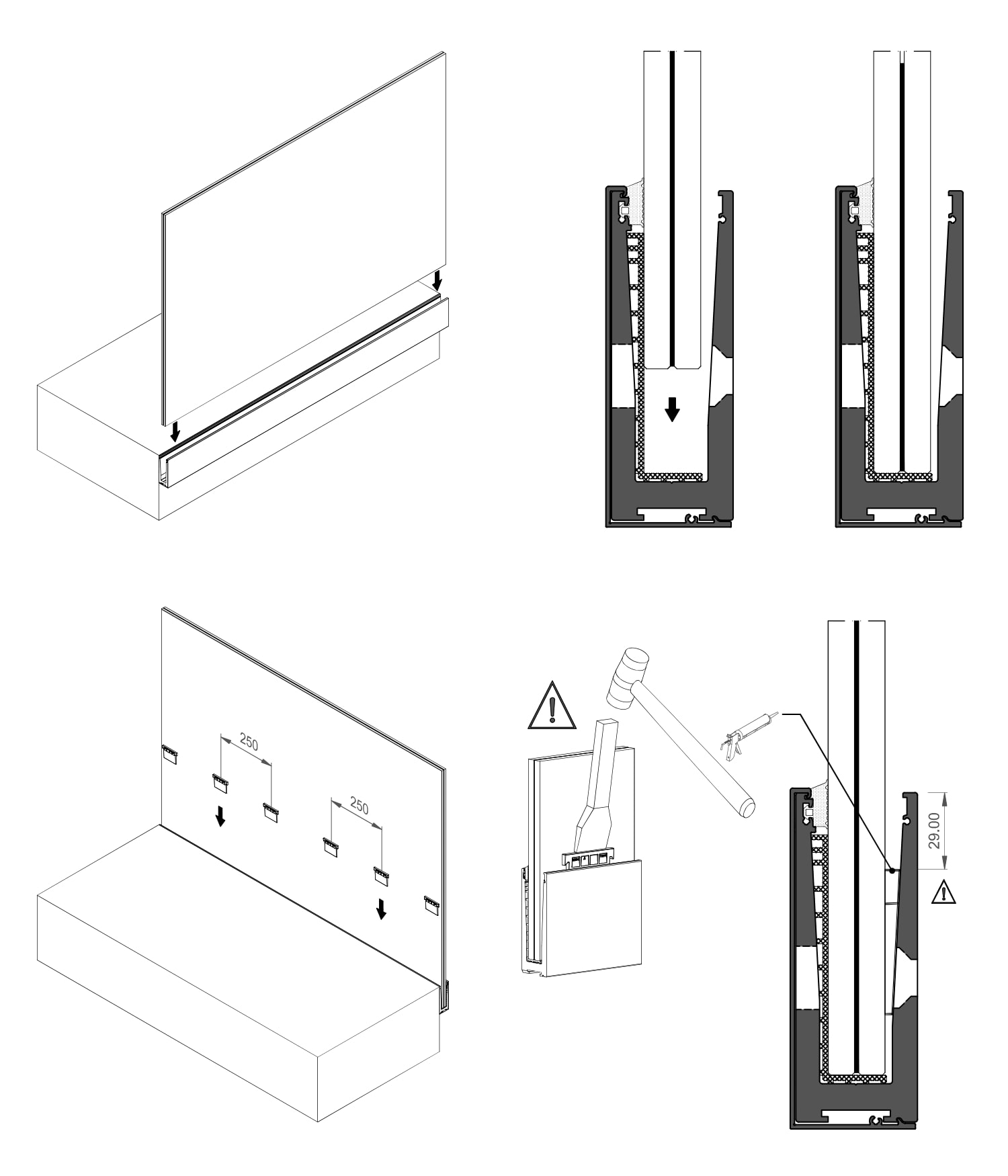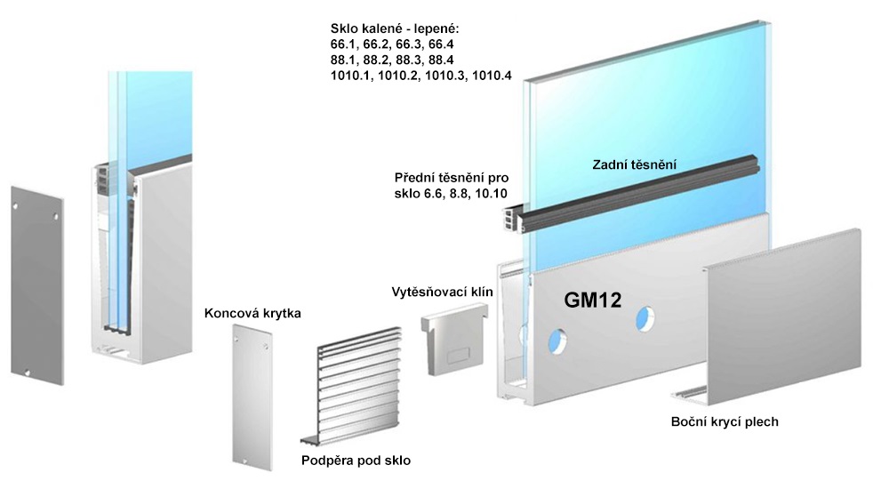 Délka profilu 6000 mm. Prodej po bm. Uvedená cena je za běžný metr předvrtaného profilu, krycí plech, těsnění, podložky a klíny – NUTNO UPŘESNIT tloušťku skla (12,76 / 13,52 mm ; 16,76 / 17,52 mm ; 20,76 / 21,52 mm). Neobsahuje koncové krytky!
