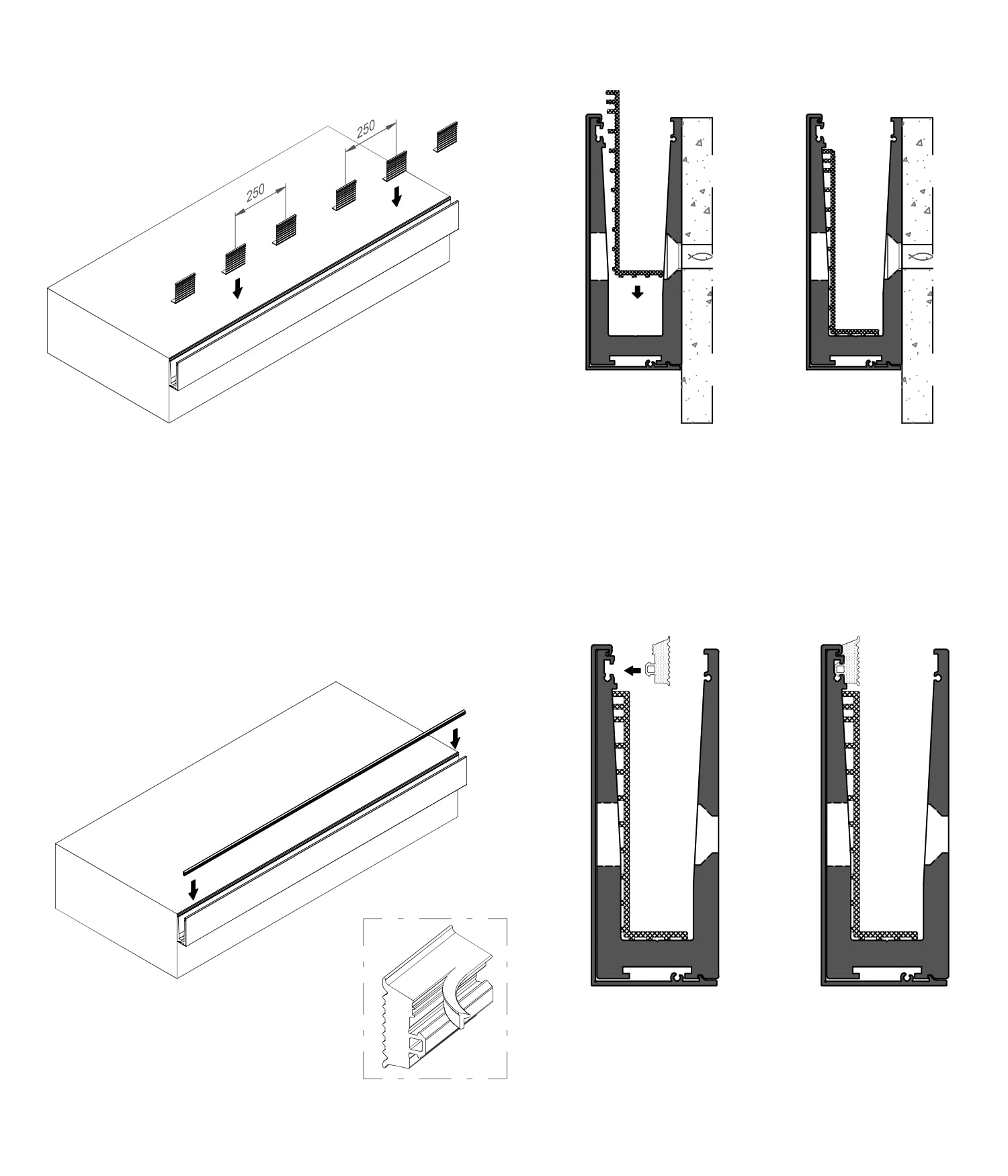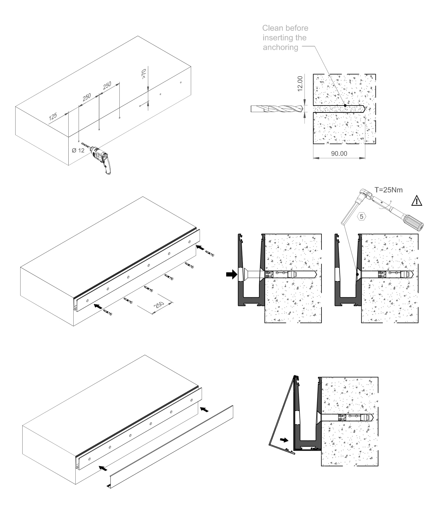 Kotevní otvory po 250 mm, umístění podložek a klínů po 250 mm