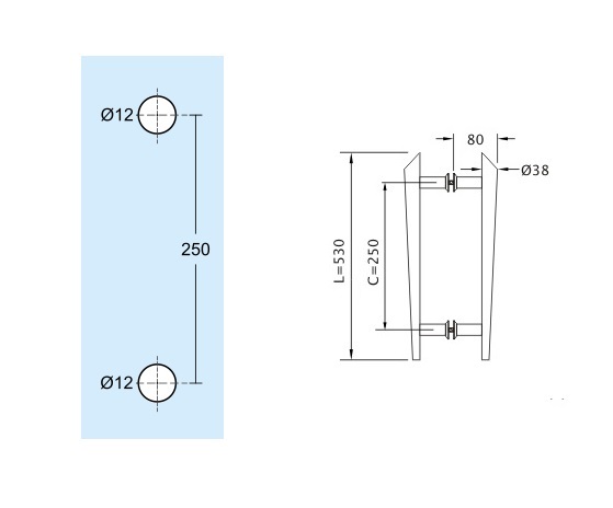 POSLEDNÍ pár! Dveřní madlo, Ø 38mm, délka 530 mm, rozteč os děr 250 mm. Cena za pár.