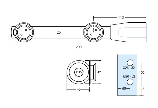 Horní závěs se zapuštěnou hlavou určený pro skleněné otočné dveře + „lítačky". Pro sklo 10-12 mm.