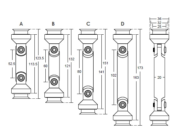 Délka ramene: A=52,5mm; B=60mm; C=82mm; D=102mm