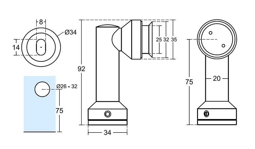 Pevná spojka sklo-zeď s jednou zapuštěnou hlavou. Pro sklo 10-12 mm, max. váha 50kg/ks.