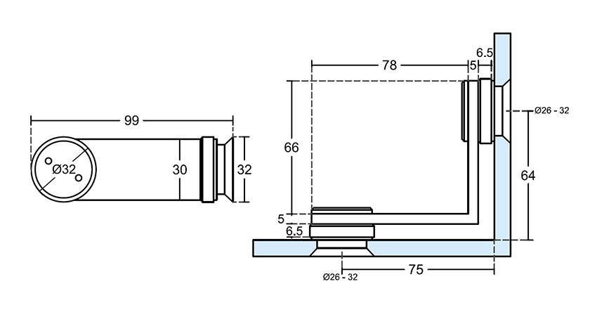 Spojka sklo-sklo 90° se zapuštěnými hlavami. Pro sklo 10-12 mm, max. váha 40kg/ks.