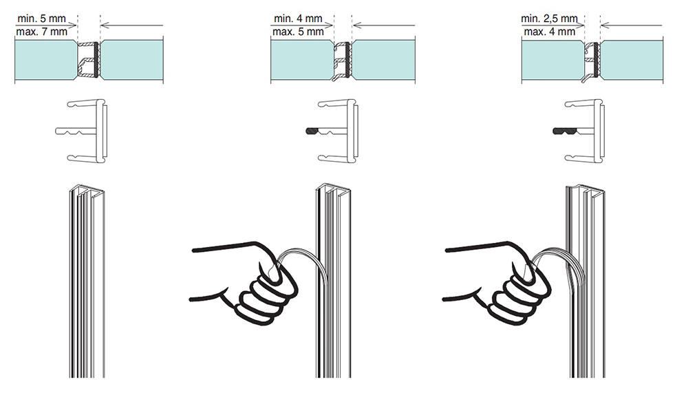 Těsnění pro celoskleněné dveře a stěny s jednoduchou montáží a vysokou pevností. Pro sklo 8 až 14 mm, pro dotěsnění mezery od 2,5 do 6 mm - nastavení jednoduchým odtržením. Délka 3000 mm. Cena za ks.