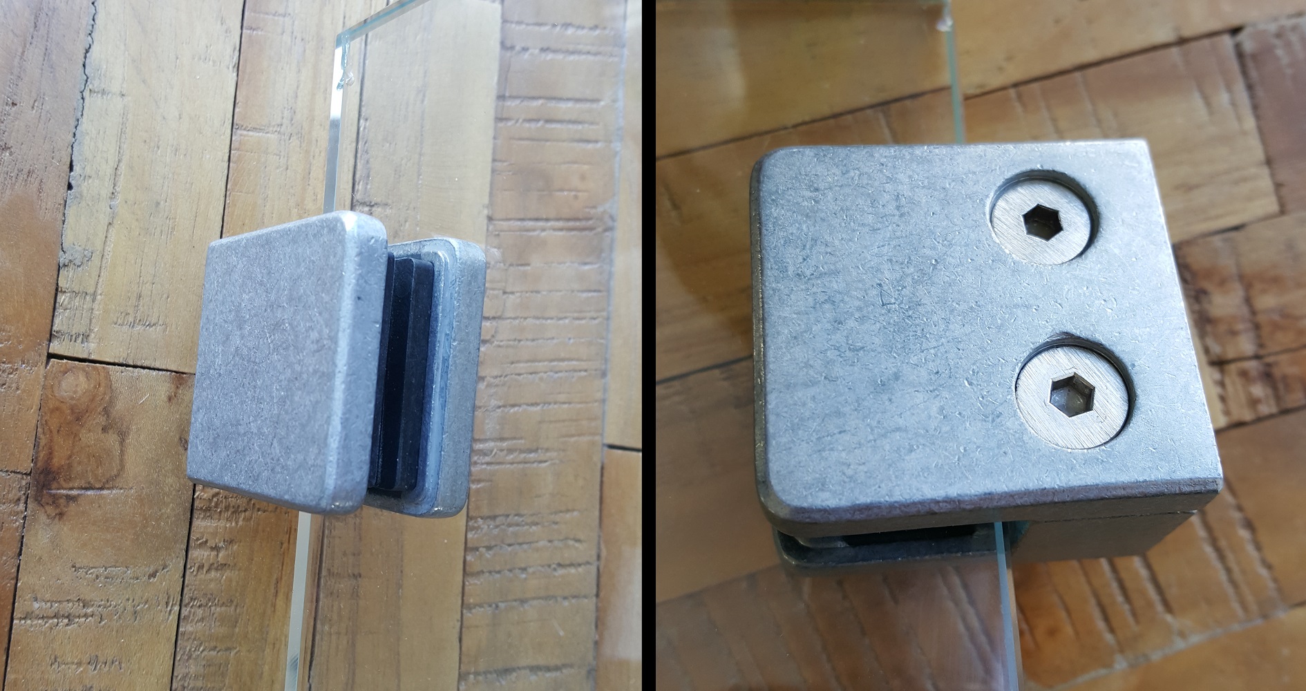 POSLEDNÍCH 10 ks! Úchyt skla pro zábradlí s bezpečnostní plotýnkou (podložkou), montáž na plochu. Součástí je těsnění pro sklo tloušťky 10 mm; 10,76 mm; 12 mm; 12,76 mm.