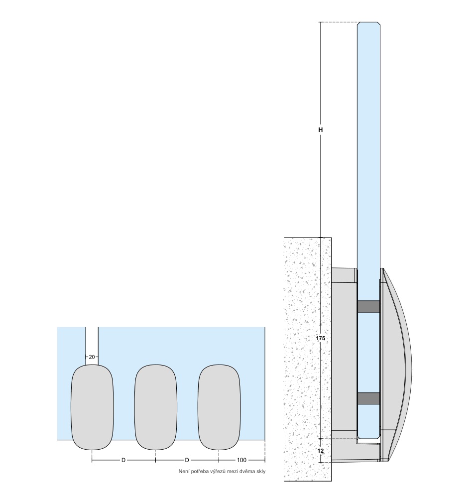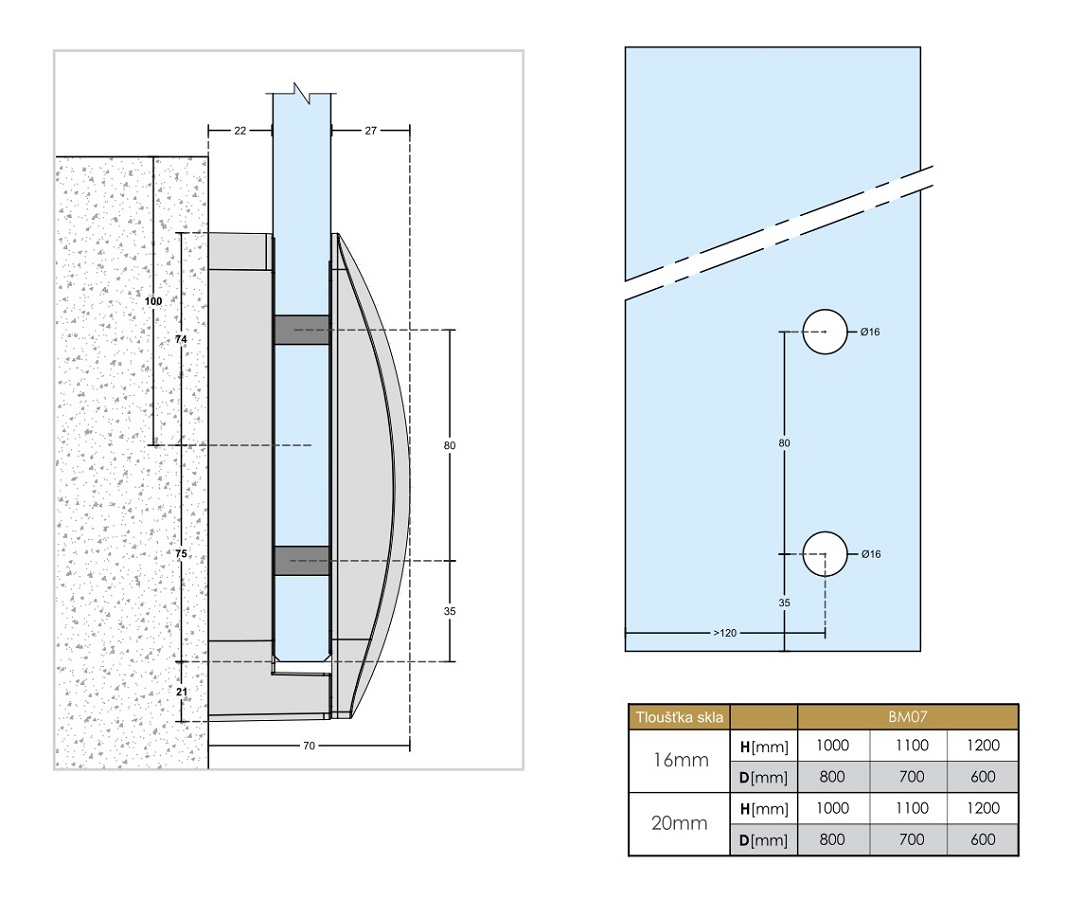 Úchyt zábradlí pro sklo od 16 do 21 mm. Max. výška skla 1200 mm, max. zátěž 1kN.
