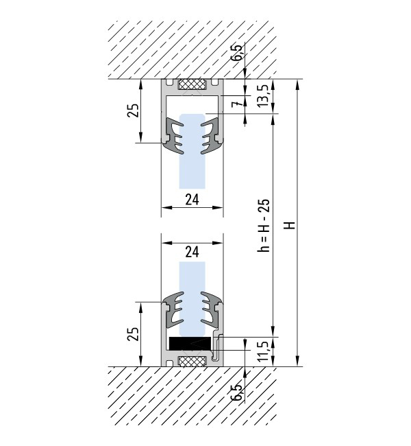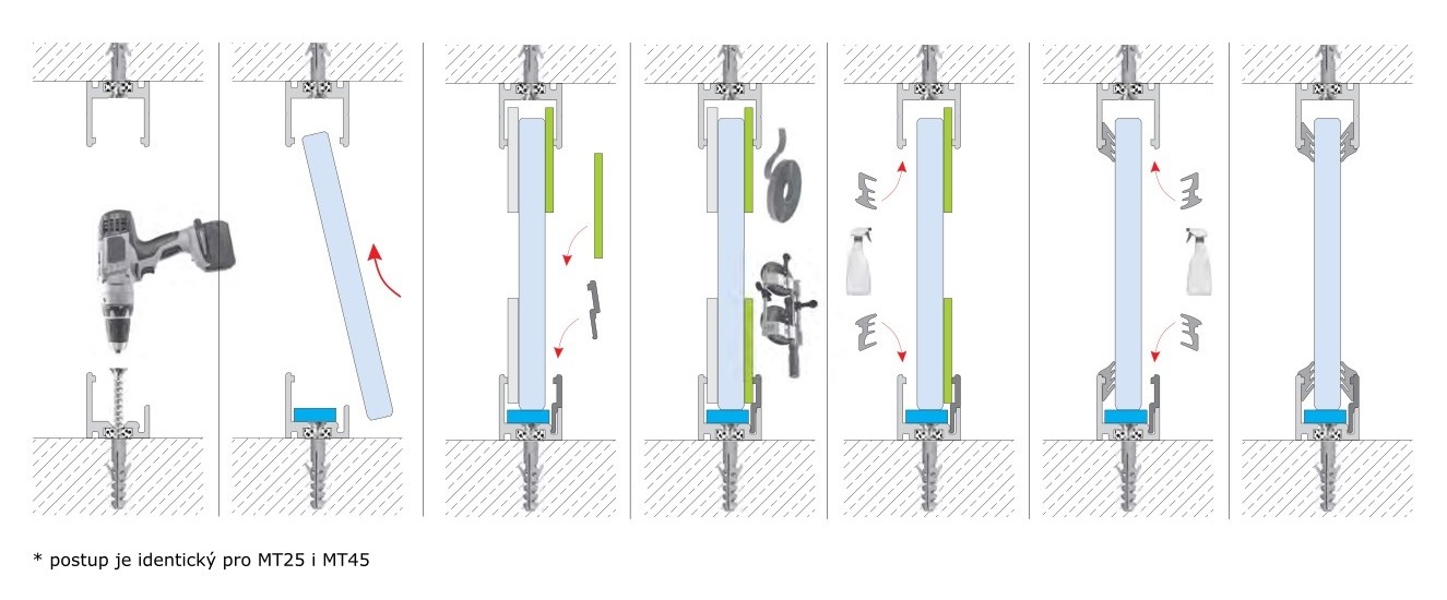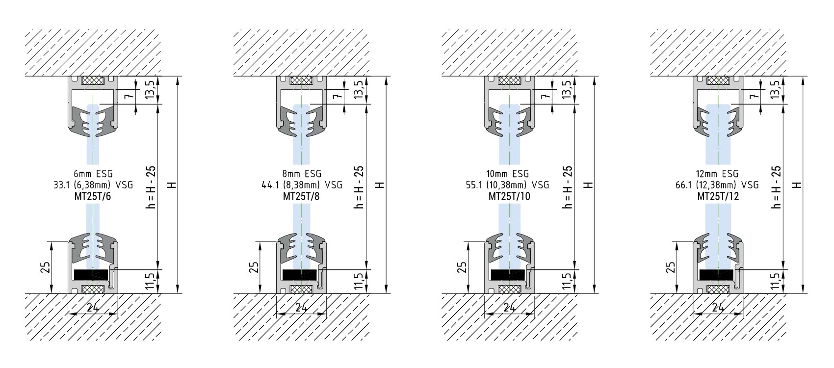 Společně se (spodním) dvoudílným profilem MT25S tvoří systémové řešení skleněné stěny. Kombinací se zárubní GT12 vytvoříte funkční prosklenou stěnu i s dveřmi v zárubni.