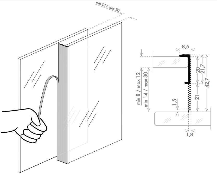 Těsnění pro skleněné posuvné dveře s jednoduchou montáží a vysokou pevností. Pro sklo 8 až 14 mm, pro dotěsnění mezery od 12 do 30 mm - nastavení jednoduchým odtržením. Délka 3000 mm. Cena za ks.