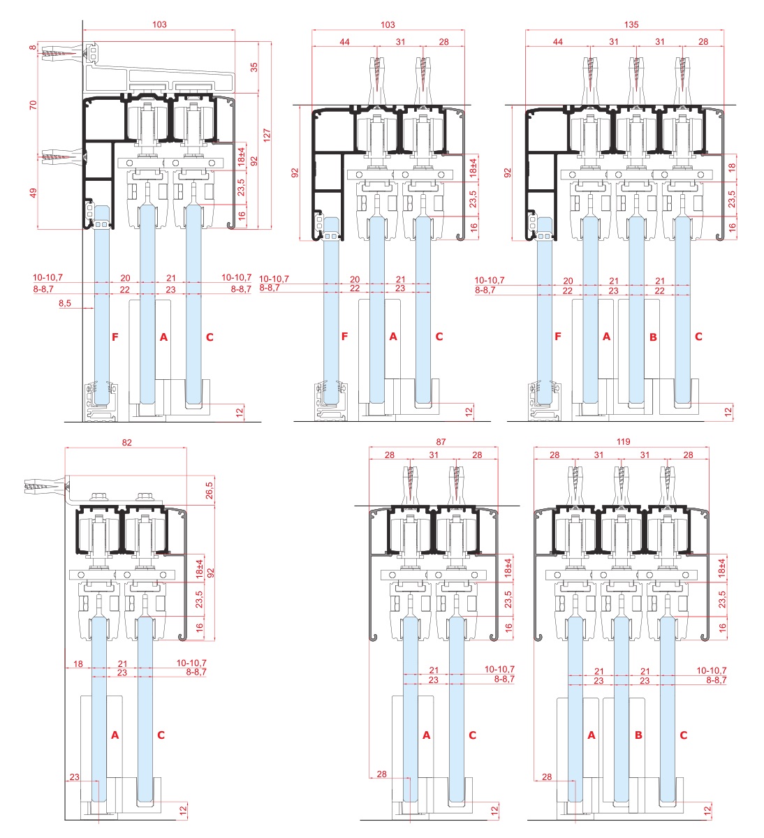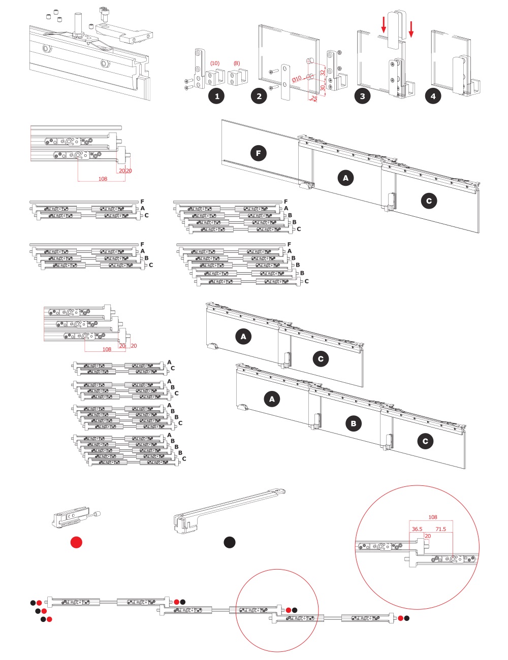 Set příslušenství pro jedno dveřní křídlo teleskopického posuvného systému DRAG 80. Pro sklo 8-10,7 mm, max. váha 80kg/křídlo, min. šířka křídla 650 mm. Set obsahuje vozíky, tvrdý doraz, kapalinový doraz, vodítko a montážní příslušenství.