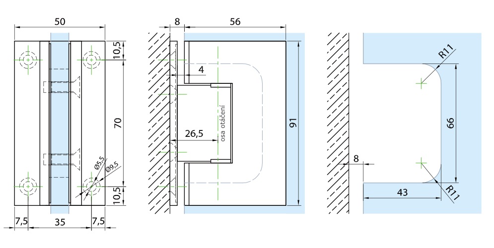 Oboustranné otevírání (aretace v -90°, 0°, 90°), automatické dovření z úhlu 35°.