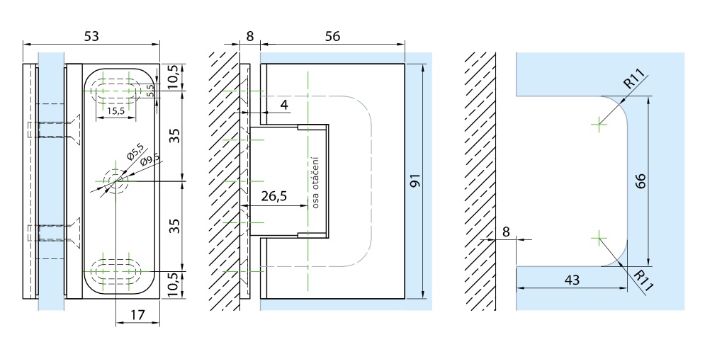 Oboustranné otevírání (aretace v -90°, 0°, 90°), automatické dovření z úhlu 35°.