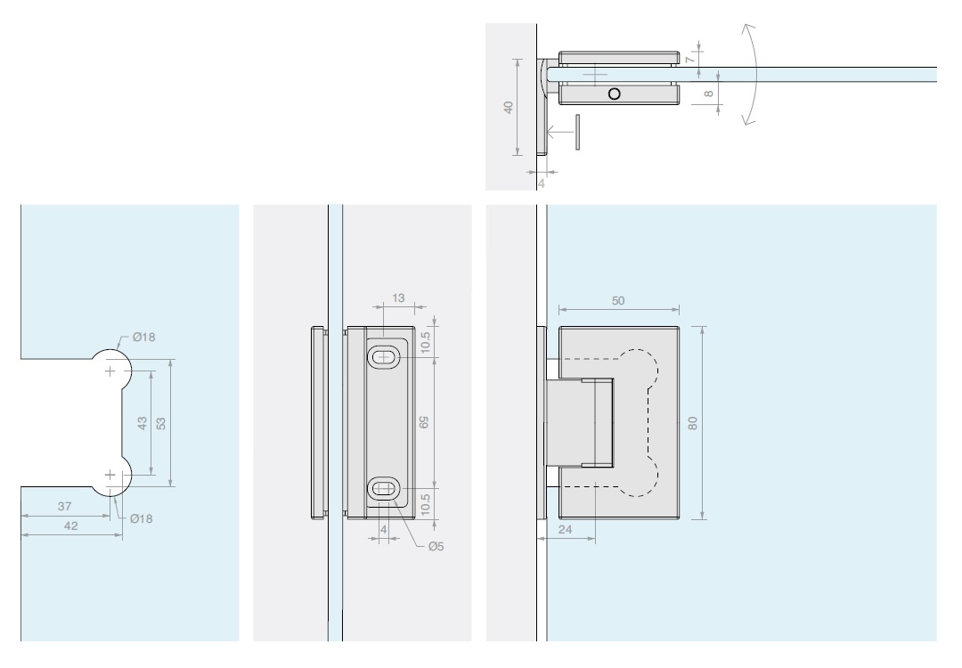 Oboustranné otevírání (aretace v -90°, 0°, 90°), automatické dovření z úhlu 30°.