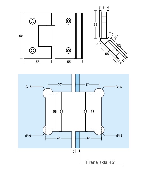 Sprchový pant sklo-sklo 135° - ostré hrany