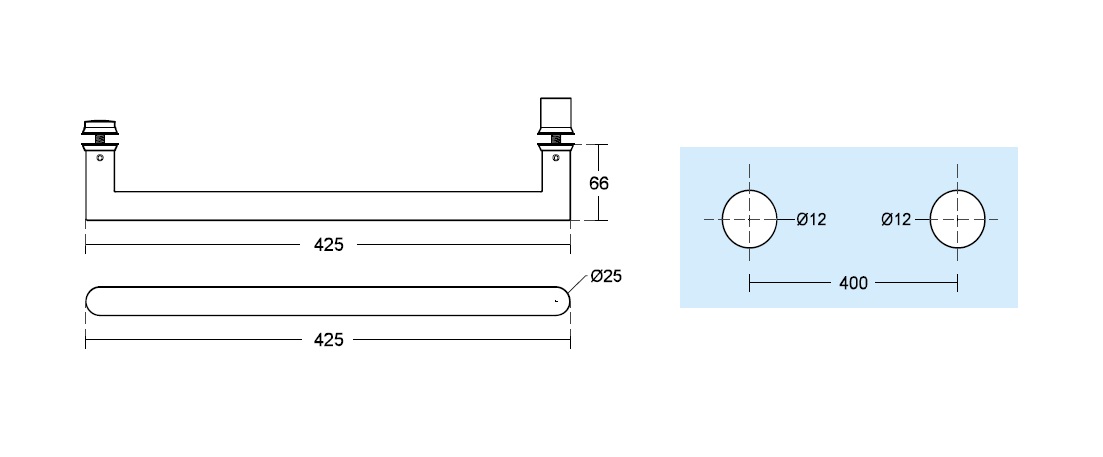 Délka madla 425 mm, rozteč os děr 400 mm, 2x otvor ve skle: ᴓ 12 mm