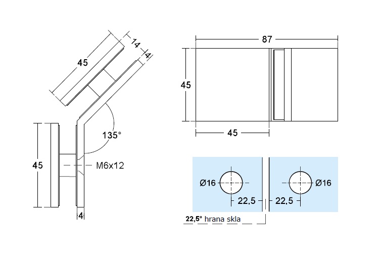 Spojka sklo-sklo 135°, pro sklo 8-10 mm. Max. 30kg/ks.