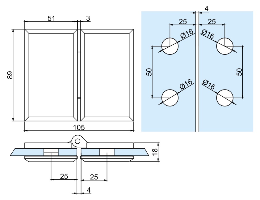 Sprchový pant sklo-sklo, pro sklo 8-10 mm, max. šířka dveřního křídla 900 mm, max. váha dveřního křídla 40 kg/pár.