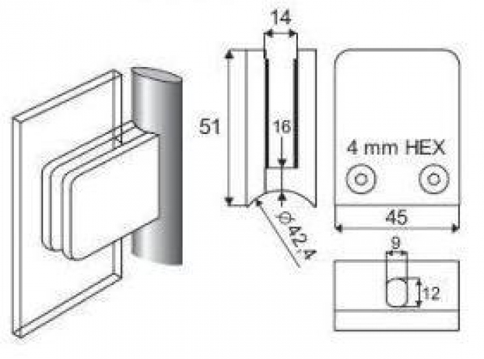 POSLEDNÍCH 18 ks! Úchyt skla pro zábradlí, montáž na trubku o průměru 42,4 mm, materiál: nerezová ocel 304. Součástí je těsnění pro sklo tloušťky 8 mm; 8,76 mm; 10 mm; 10,76 mm.