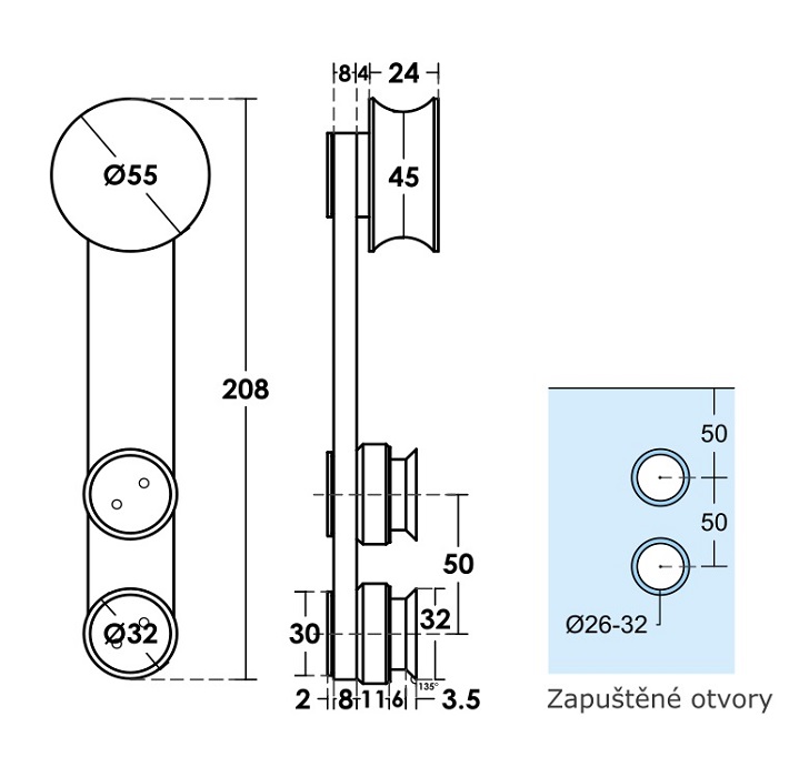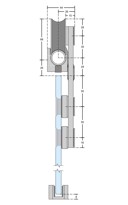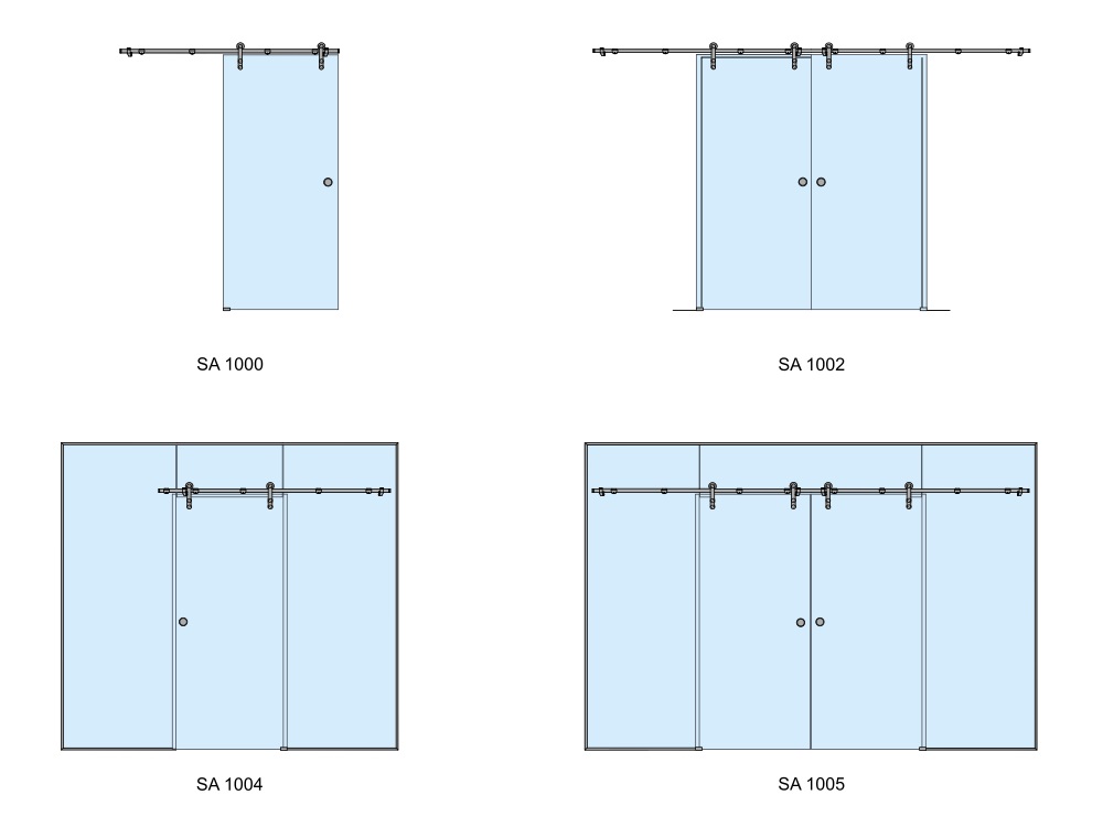 Vozík k posuvnému systému SA. Pro sklo 10-12 mm, max. váha křídla 80 kg/2 ks, max. šířka dveřního křídla 1000 mm.