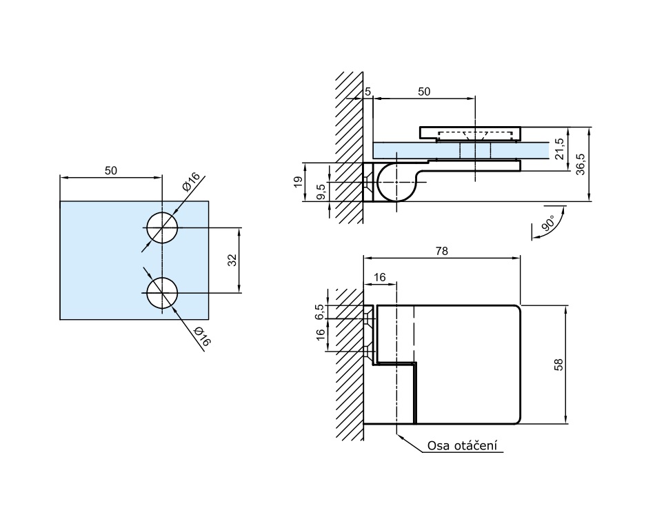POSLEDNÍ 2 ks! Zvedací pant sklo-stěna 90°, pro sklo 8-12 mm, max. nosnost 45kg/pár, LEVÝ.