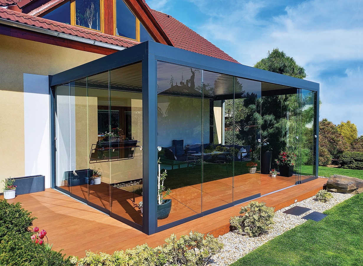 Bezrámová posuvná stěna Harmonia je vhodná pro zasklení teras či pergol. Poskytuje nerušený panoramatický výhled do okolí a chrání před nepřiznivými vlivy počasí. Lze ji využít i pro oddělení prostor v interiéru nebo integrovat do bioklimatické pergoly.