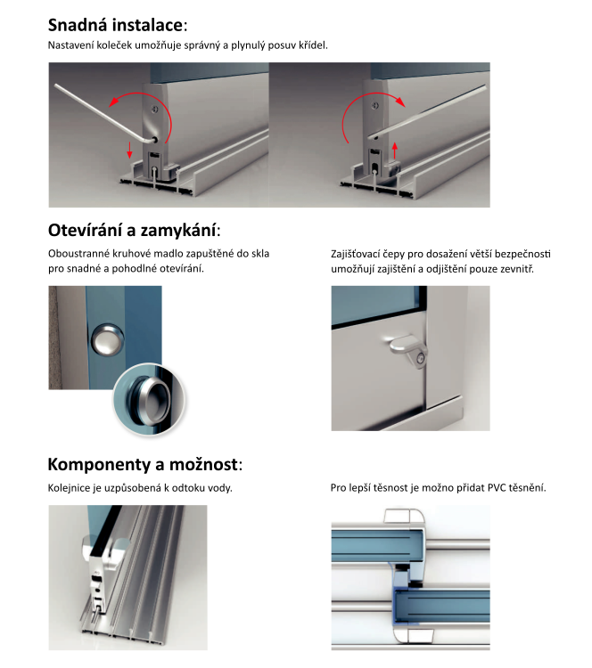 Minimalistický systém tvořený z hliníkových profilů vyniká rychlou a jednoduchou instalací, nenáročnou údržbou a dlouhou životností. Systém umožňuje paralelní a horizontální pohyb skleněných křídel na jednu nebo obě strany. Plynulý chod posuvných křídel zajišťují nastavitelná kolečka, která jsou osazena ve spodním profilu rámu. Krajní křídla mohou být vybavena zajišťovacími čepy pro dosažení větší bezpečnosti.