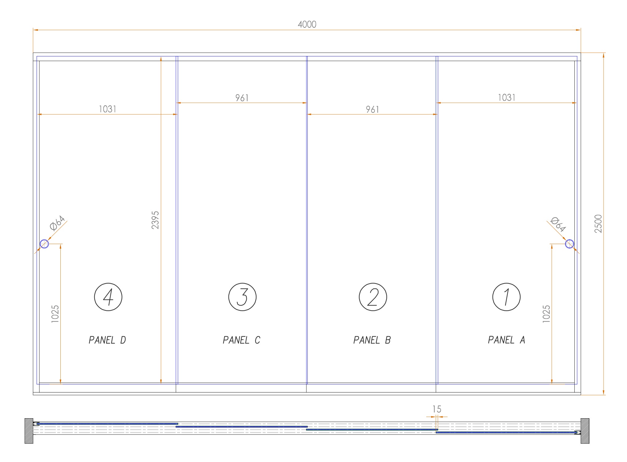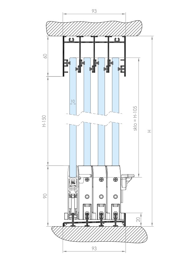 Uvedená cena je za posuvnou stěnu o rozměru 4000 x 2500 mm (š x v), 4 panely s čirým bezpečnostním sklem ESG 10 mm. Kolejnice a kování jednotlivých panelů jsou standardně v povrchové úpravě stříbrný elox, kruhové madlo je v kartáčovaném provedení. Montážní materiál není součástí dodávky (doporučený spojovací materiál naleznete v návodu níže).