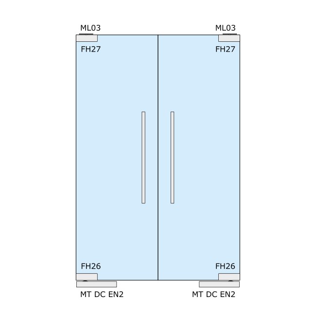 Set kování FH-SET-4 je určený pro dvoukřídlé celoskleněné otočné a kyvné dveře („lítačky“). Kování je navrženo tak, aby poskytovalo plynulý a bezpečný pohyb dveří při běžném každodenním používání.