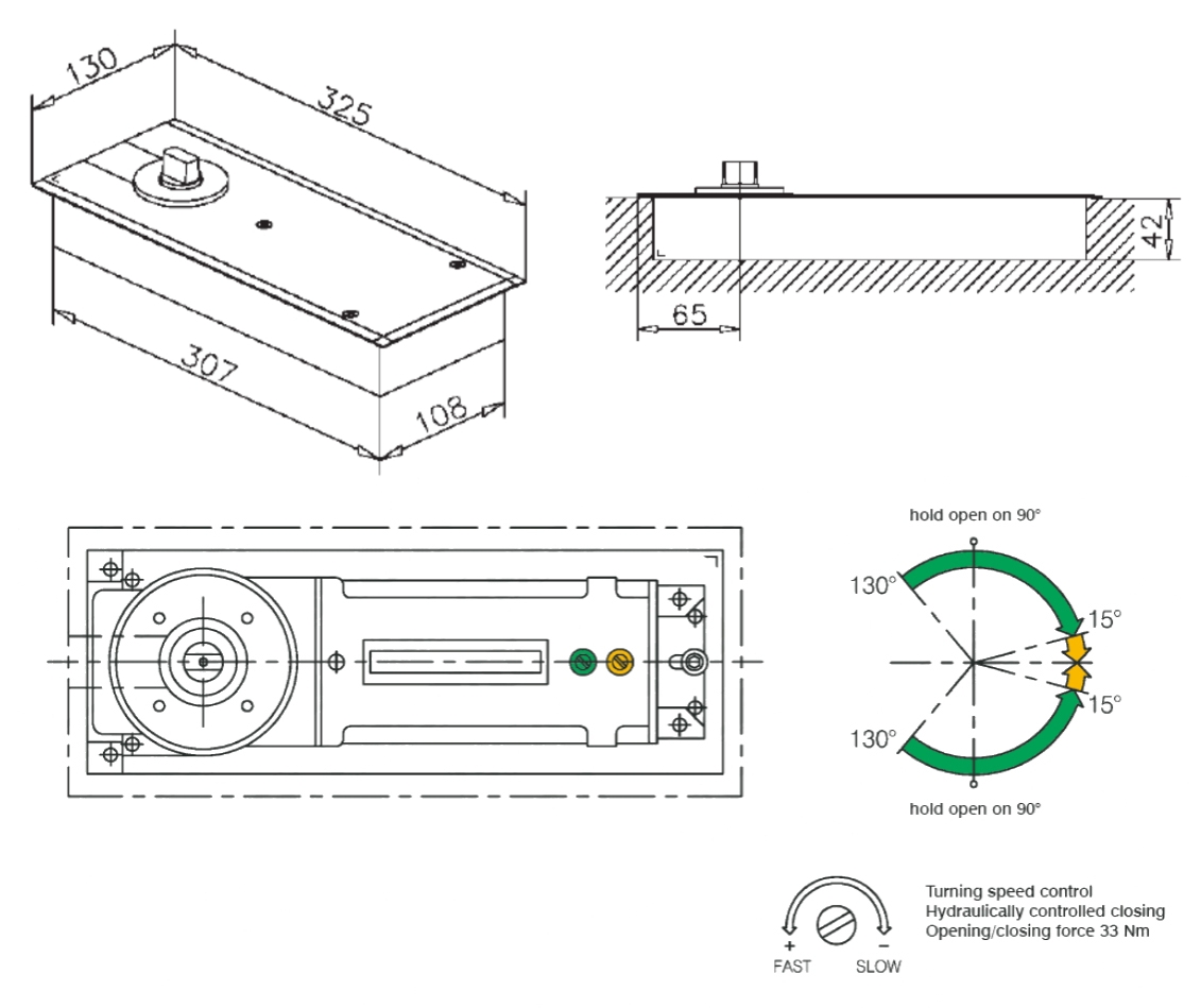 Sada obsahuje 2x dolní rohový závěs, 2x horní rohový závěs, 2x podlahový samozavírač a 2x horní čep.