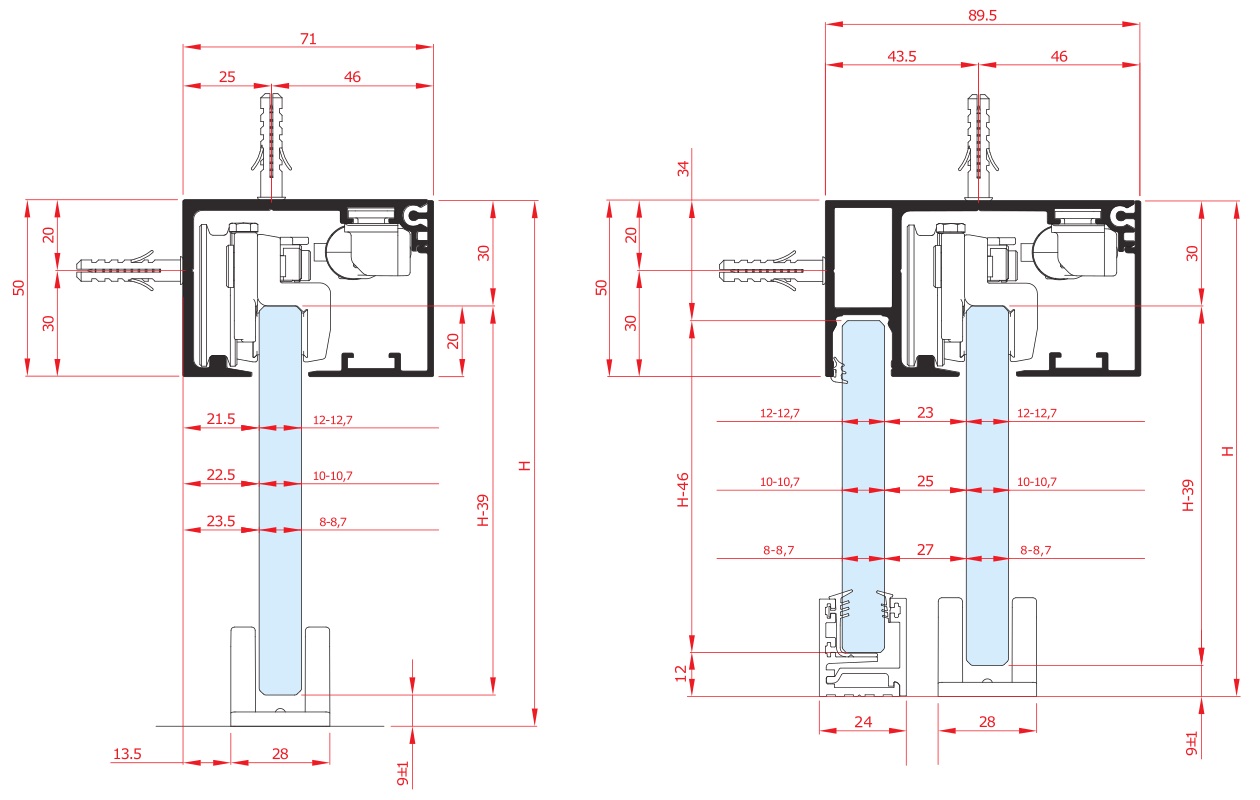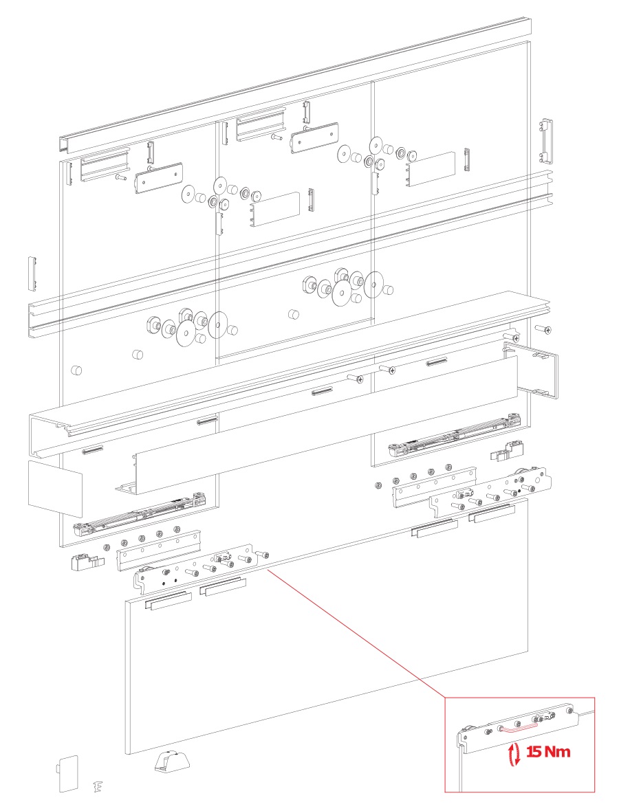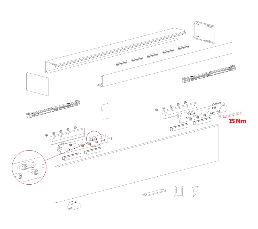 Set příslušenství pro posuvný systém MICRO 80. Set obsahuje klampy s vozíky, tlumené dorazy (softclose), podlahové vodítko, boční krytky, příslušenství. Pro sklo 8-12,7 mm, max. váha křídla 80 kg, min. šířka křídla 700 mm. NENÍ POTŘEBA VÝŘEZŮ DO SKLA!