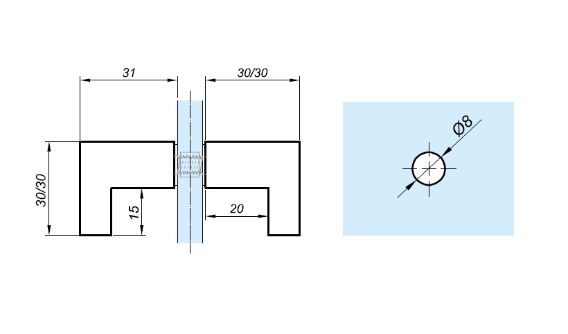 POSLEDNÍCH 7 ks! Dveřní úchyt, rozměr 30x30mm, pro sklo 6-12 mm. Cena za komplet.