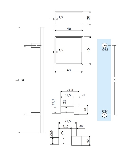 Délka madla 600 mm, rozteč os děr 400 mm, 2x otvor ve skle: ᴓ 12 mm