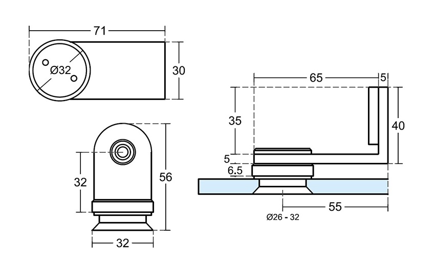Spojka sklo-zeď 90° s jednou zapuštěnou hlavou. Pro sklo 10-12 mm, max. váha 40kg/ks.
